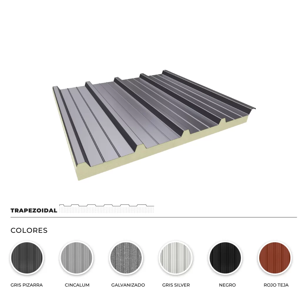 Panel metálico con diferentes núcleos aislantes. Conformado con cara superior trapezoidal, en lámina de acero galvanizado/prepintado/cincalum. Cara inferior en lámina de acero galvanizado/prepintado, tableteado. Utilizable para cubiertas y revestimientos en muros de edificaciones industriales, comerciales y residenciales. Pendiente mínima recomendada del 5%. Apto para fachadas por la rigidez que le proporcionan sus nervaduras.