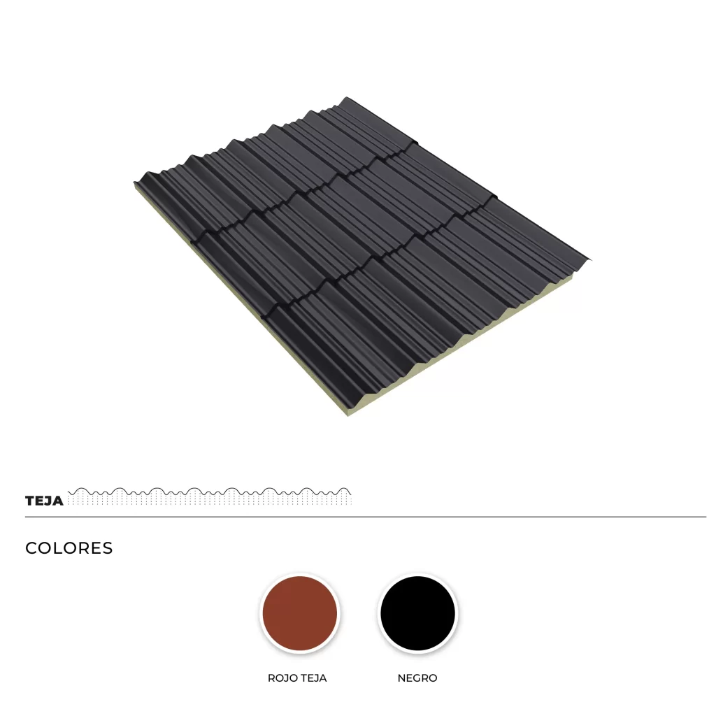 Panel metálico con diferentes núcleos aislantes. Conformado con cara superior tipo TEJA FRANCESA en láminas de acero prepintado o cincalum, y cara inferior en foil de polipropileno de alta resistencia. Utilizable en cubiertas de edificaciones industriales, comerciales y residenciales. Pendiente mínima recomendada del 5%.